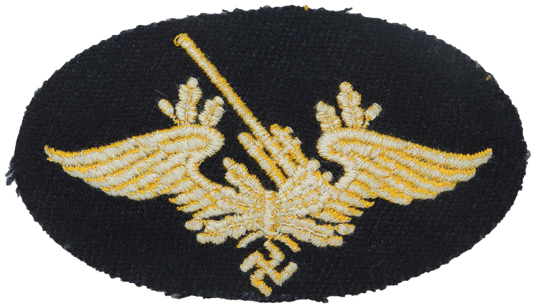 (Flakartillerie Tätigkeitsabzeichen)Identical in design to the Luftwaffe pattern, but in yellow and blue. Badge consists of a horizontally oval, dark navy blue wool base with a machine embroidered likeness of a large 88mm flak gun barrel flanked by stylized wings, superimposed on an opened top, oak-leaf wreath with a canted swastika to the bottom center all in golden rayon threads. Scarce!