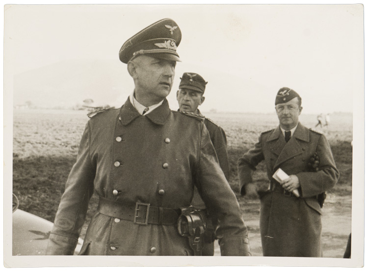 A 18cm x 13cm, black and white press photograph. Nice image of General der Fleiger Alfred Mahnke in Southern Italy. Photo is dated December 12th, 1943.