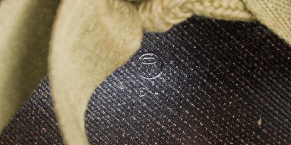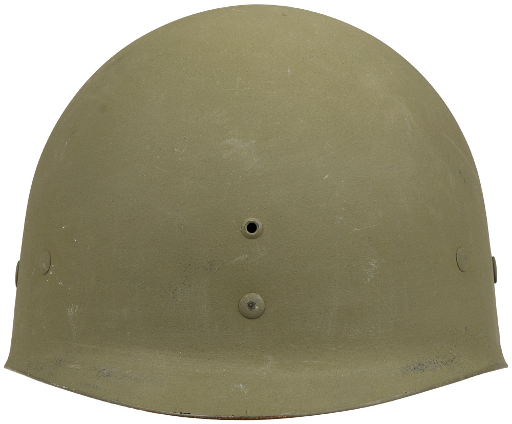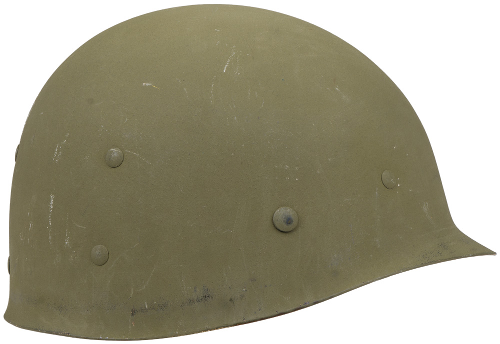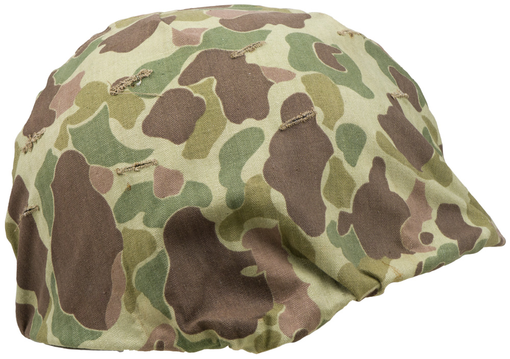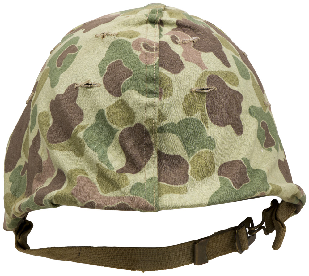The M-1 helmet was developed as a replacement for the M-1917 helmet that had seen use since WW1. It was designed by using the crown of the M-1917, removing the brim and adding extensions to protect the neck, ears, and forehead. The resulting form was then used as a template for the production of a helmet body from a single piece of Hadfield Manganese Steel. The liner and suspension were developed after a modified Riddel Football helmet. The M-1 helmet was approved for production in June of 1941. Early models had solid loops (fixed bale) for the chin straps but they broke off to often and were replaced with a moveable hinged loop. The original rim of the helmet was made of stainless steel but it was found that the paint that was used would wear off to easily and leave a shiny reflective surface. To remedy this they switched to a Hadfield Manganese Steel and also changed the butt of the rim from the front to the rear of the helmet body. This change took place in October of 1944. The M-1 helmet had the best ballistic characteristics of any helmet developed up to then and could with stand the force from a 230 grain, .45 caliber bullet with a velocity of 800 feet per second.PHYSICAL DESCRIPTION: A two-piece helmet, comprised of a liner and a Manganese shell. The shell retains approximately most of its rough-textured olive drab paint. Fixed bail loops with original chinstrap. The high pressure plastic liner has a dark brown and tan vertical stripe design visible to its interior surface, resulting from its segmented construction, with original paint almost 100% retained. There are six rivets for the "Riddell" suspension system, three for the neck strap, as well as two larger garter stud rivets for the chin strap, and an eyelet to the front center for insignia, are visible to the exterior. All straps are complete and in good condition. Included with the helmet is a USMC pattern cammo cover. Two piece, cotton HBT construction, with printed splotch pattern camouflage. Cover has one central stitched seam with both sides being of identical shape, with extended flaps. The flaps are folded up between the helmet and the helmet liner to secure cover in place. Camouflage patterns consists of four colors to "jungle" side in greens, browns and tans, and three colors to the "beach" side of browns and tans. Superb helmet and cover!