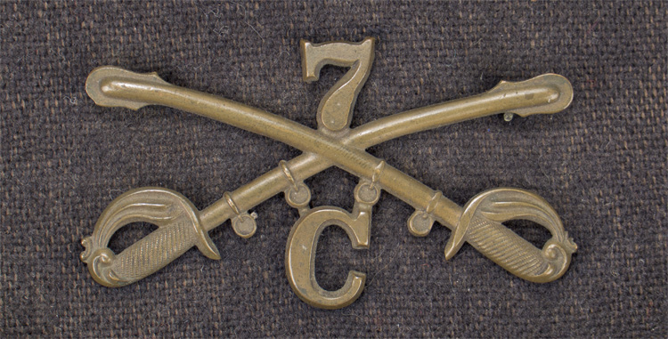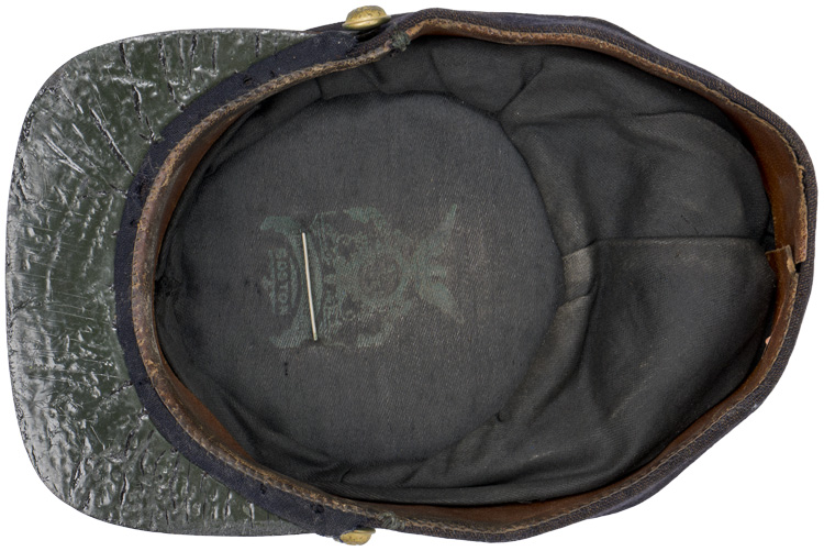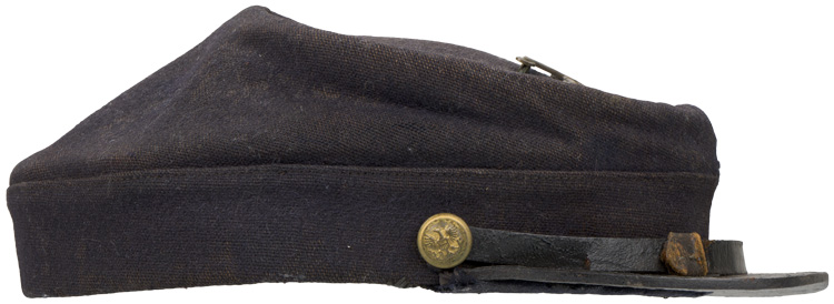 This is a Model 1872 Kepi from the Indian war period . The blue wool is in excellent condition with no nothing , A 1 1/4 sweatband is completely intact all stitching is strong throughout the kepi , The two general service buttons are two piece design and show no back marks , The black leather chin strap , the black tarred visor and brown leather sweatband are in remarkable condition , There is a makers label in the top of the Kepi , hard to read but Boston Mass is clearly visible , pinned to the top is a brass cavalry insignia with the number 7 above the letter C just a foot note c troop 7th cavalry was commanded by captain Thomas Custer This complete 100% original Kepi is a key item for the Indian Wars that replaced the Civil War pattern