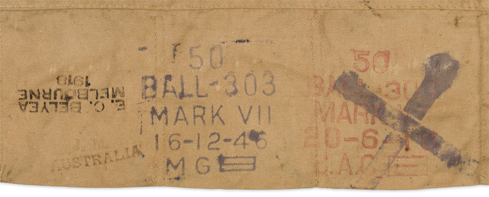 A five pocket, cotton constructed bandoleer to hold 10 rounds of Mark VII .303 ball ammunition. A small copper wire clip is sewn to each pocket to prevent the loss of ammo. The bandoleer is manufacture marked and dated "E.C. Belyea’ "Melbourne" and "1918" but was reissued and dated for "16-12-46." It is also war department marked. The bandoleer shows moderate usage and wear with staining and various markings, but this only makes this a very nice, used and salty example.