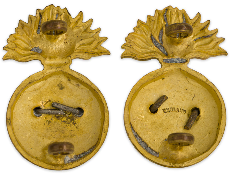 A pair of gilt and silver collar badges in the shape of a "flaming grenade" with left and right facing polar bears. A pair of split pins are to the reverse of each. One is marked "England" to the center.