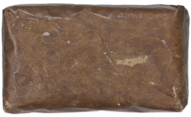 A printed, and oil brown paper wrapped 3cm x 6.5cm x 11cm packet. No contents. Perfect for living history re enactment.