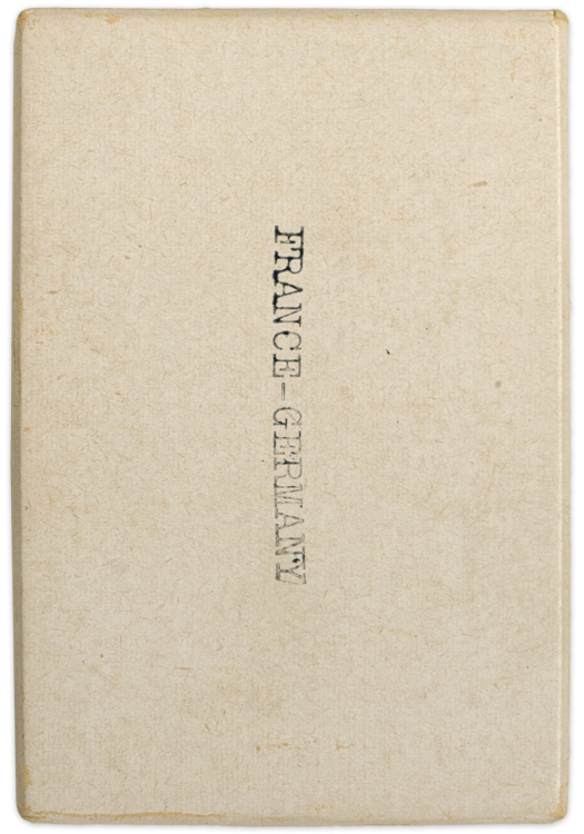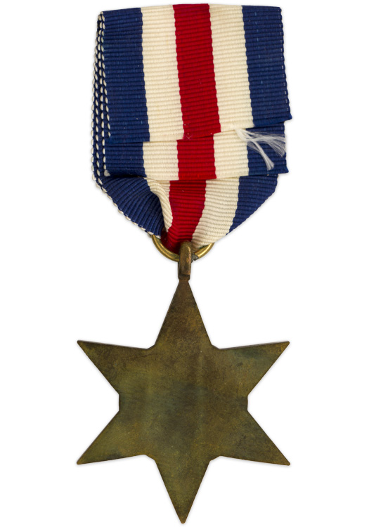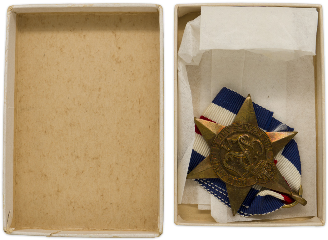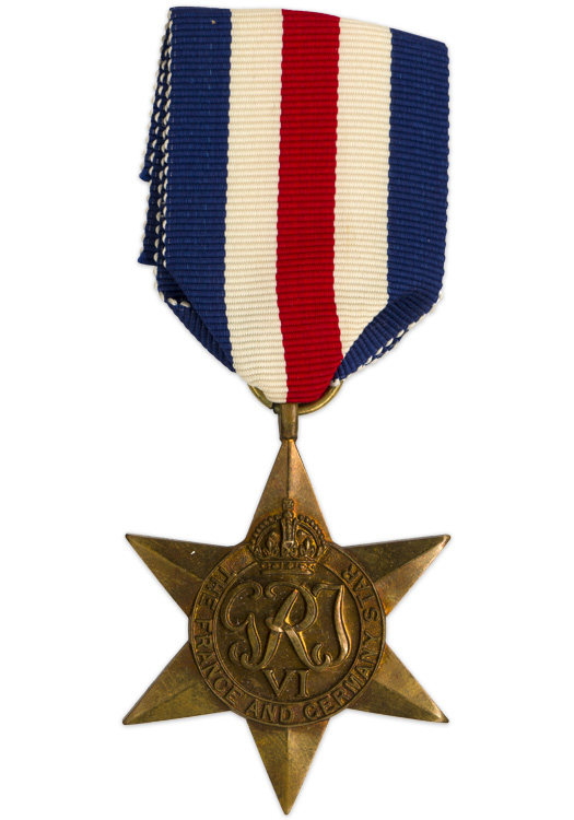 Awarded for service in France, Belgium, Holland or Germany between D-Day and the end of the war, the medal takes the form of a six-pointed tombac star, 4cm from point to point, whose uppermost point features a suspension loop. To its slightly domed, obverse center is the stylized Royal Cipher "GRI," with "VI" beneath it, surmounted by a King’s crown and with "The France And Germany Star" on an age darkened background scrolled around it. Its reverse is featureless. The medal has a ring fed through its suspension loop, with its, ribbed moiré ribbon passing through the ring. The ribbon has dark blue-white-red-white-dark blue vertical stripes to it, each in the same width, representing the flags of the Union, France and the Netherlands. Included is an original two piece cardboard box with friction top lid that is stamped "France-Germany".