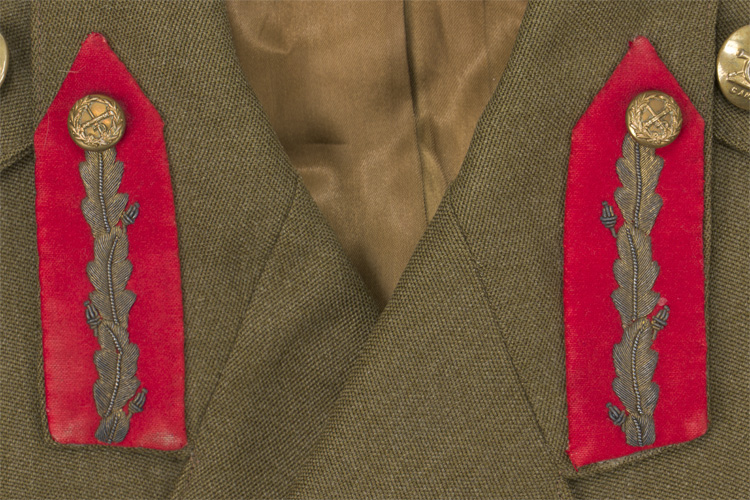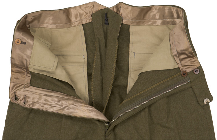 3. The matching service trousers have a pleated front, metal zipper, buttons at the waist, along with a hook and eyelet. Six matching buttons extend the outside of the waistband that allow for the attachment of suspenders. The waist measures approximately 31" with a 29" inseam.