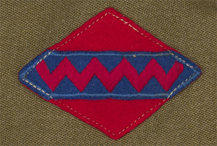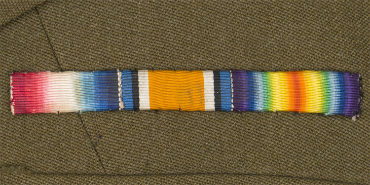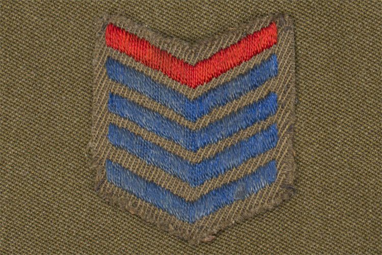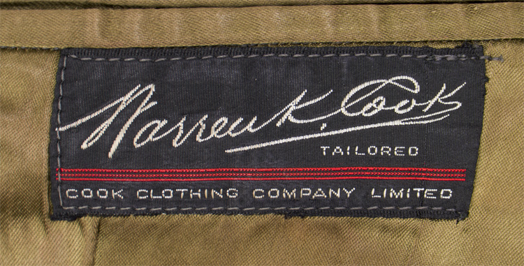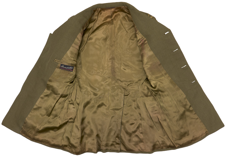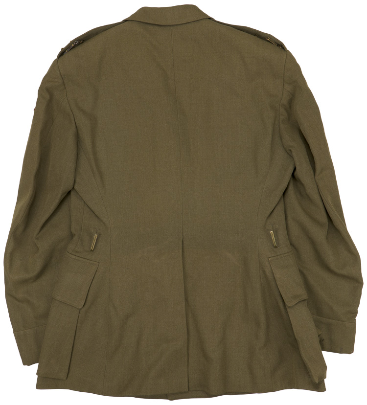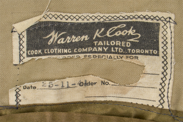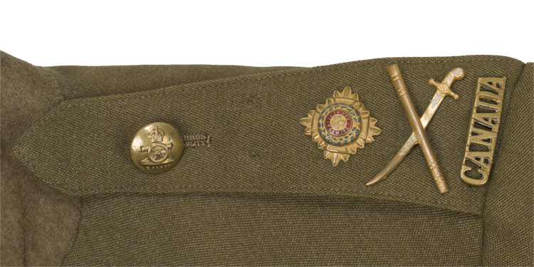 2. A standard khaki service tunic with four button front, lay down collar and integral shoulder straps. Two breast pockets with scallop button flaps and two large patch pockets complete the front. To each shoulder strap are badges that represent the rank of Major General along with a "Canada" brass shoulder tile. It appears that one of the rank badges was removed as there are holes to each strap. A pair of “General” collar tabs are sewn to each point of the collar. A shoulder flash for 1st Canadian Army Group, Royal Artillery is to each arm. Overseas bars are present above the left cuff. A WWI , three place ribbon bar is above the left breast that represents the British 1914-1915 Star, The British Warm Medal 1914-1918 and the Victory Medal 1914-1919. Brass belt hooks are to each side seam. The interior is fully lined with a manufacture tag of “Warren K. Cook” to the outside of the breast pocket, while the interior tag has been partially cut away. The chest measures approximately 38". A khaki lanyard is included, as well as a Canadian artillery brassard with maple leaf badge.