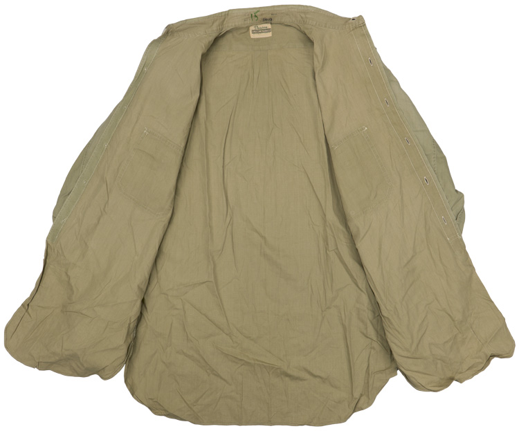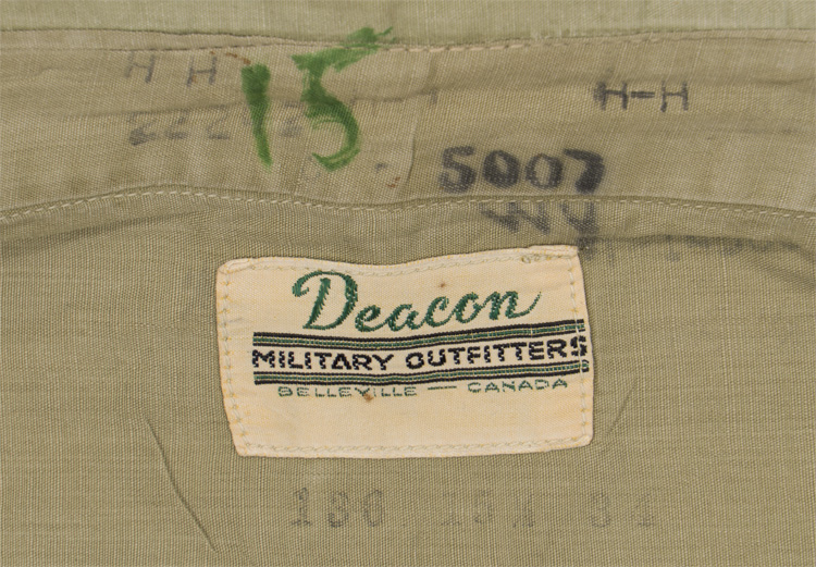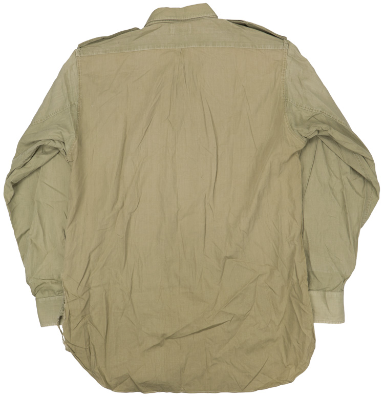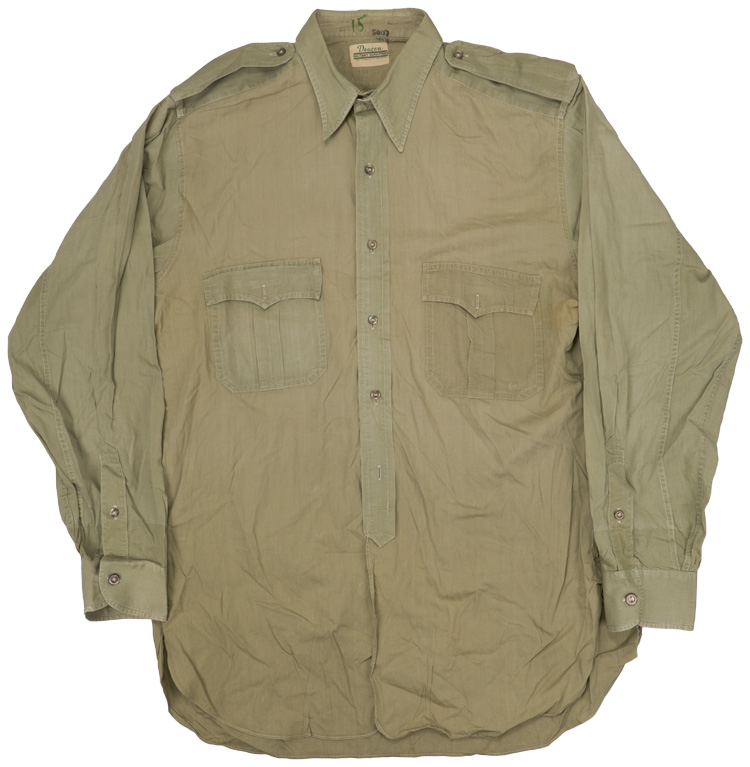 4. A long sleeve, cotton shirt with five mis-matched, out of the original six, buttons to the front. There are a pair of breast pockets, with only one button to the flaps, button cuffs, and epaulets. A manufacture tag for “Deacon Military Outfitters” is to the interior. The shirt is heavily wrinkled. Included is a 116cm long neck tie.