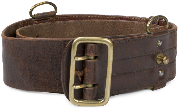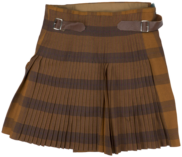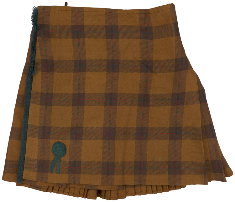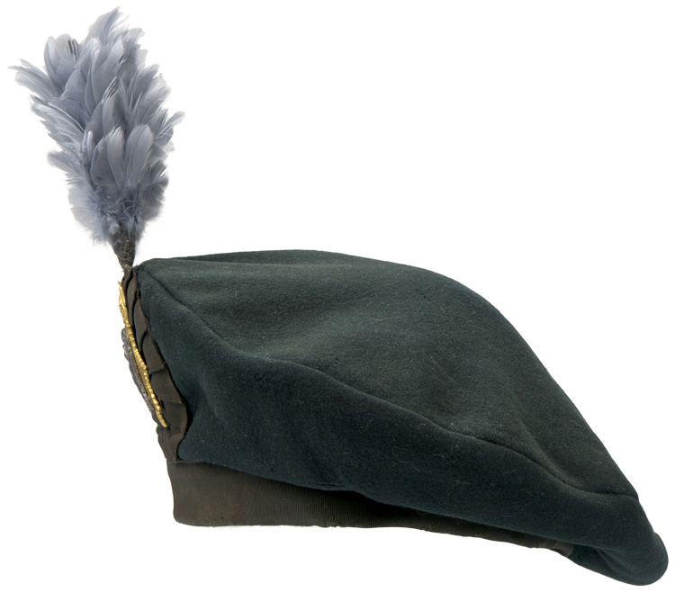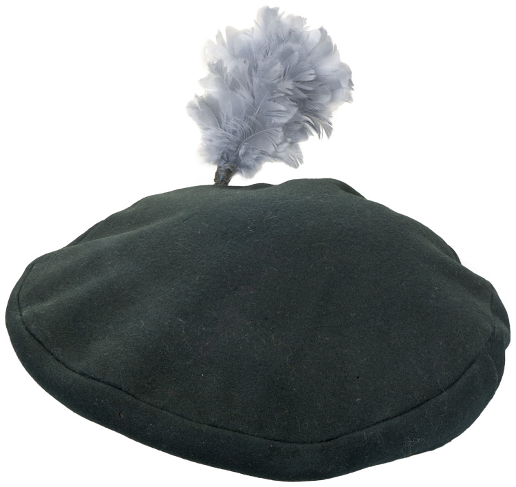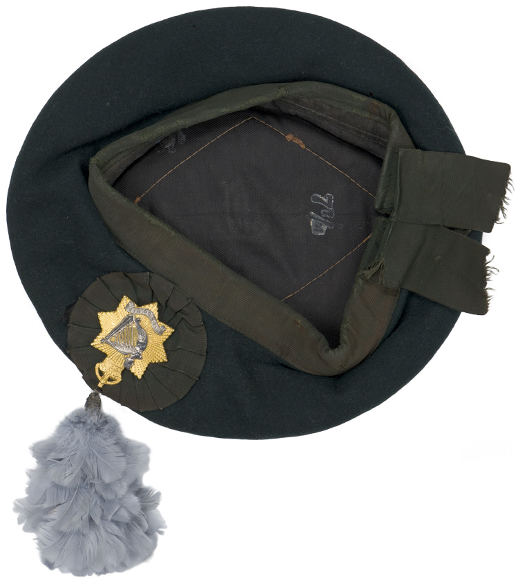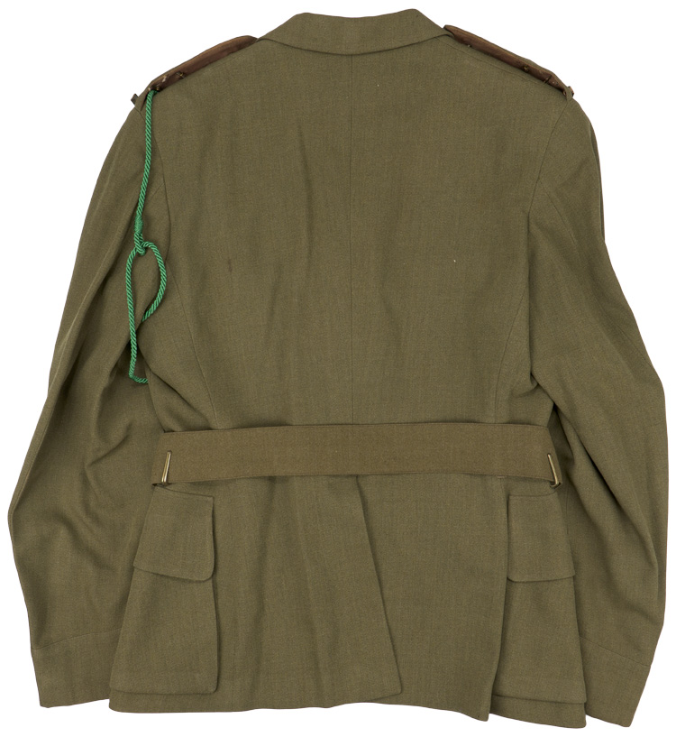 This group consists of a green wool caubeen with an officer’s light blue hackle, bi-metal cap badge on a black rosette and a size 7 1/4. The wool cut away tunic with the front cut out and tapered away toward the hips. Four brass buttons are to the front with a lay down collar and integral shoulder straps. Two breast pockets with scalloped flaps, as well as two hip pockets with straight flaps, with curved fronts that follow the lines of the jacket, are present. All buttons are identical to those running to the front. Matching bi-metal collar dogs represent the Irish Regiment are present to each point. Each shoulder strap has a pair of pips that denote the rank of Lieutenant along with "Canada" brass shoulder tiles. A green lanyard extends around the left shoulder. The manufacture tag has been removed from the interior breast pocket. The chest measures approximately 36". Included is a belt of the same material as the tunic, and a pair of brass belt hooks. A pleated wool kilt in the pattern of the Irish Regiment of Canada with a pair of brown leather straps with the corresponding single prong buckle to each side. A green rosette (or bow) is to the front bottom left. This rosette or bow is worn by Senior NCO’s of this regiment. The interior of waist in fully lined. The straps look to have been replaced/modern. The waist measures approximately 38" and is 23.5" long. Lastly, is a brown leather Sam Browne belt that measures approximately 104.5cm long. Of Note: As per the vendor, the tunic is attributed to, but not named to Capt. R.L. Grout IRC of Vancouver. (Ex Taboika Collection)