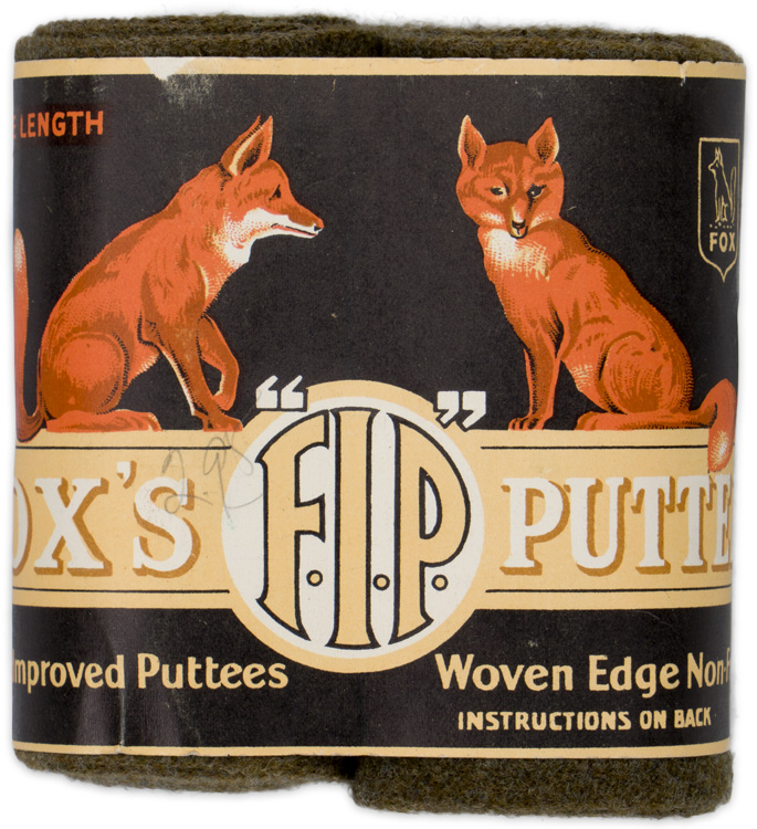 A pair of uni-issued, un-worn, khaki wool leg wraps in orginal paper wrapping. Fox produced puttees during both World Wars and also for the civilian population.
