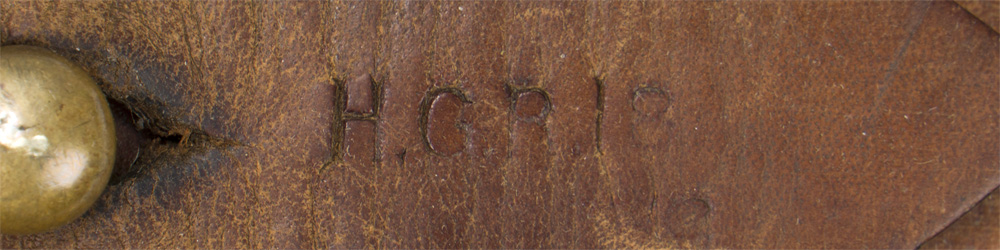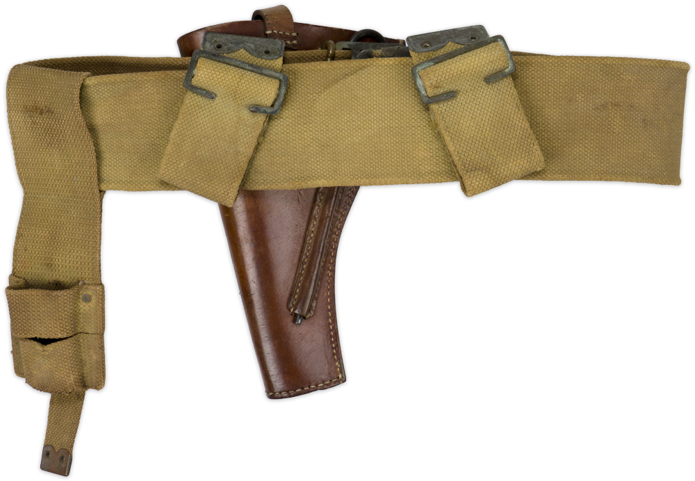 A 97cm long, khaki webbed belt with a webbed bayonet frog (marked “M.E.C. 1916, as well as broad arrow marked) , as well as a leather revolver holster attached. The holster is embossed to the front strap “H.G.R. 18" with a pair of brass hooks to the reverse. Cleaning rod is included.