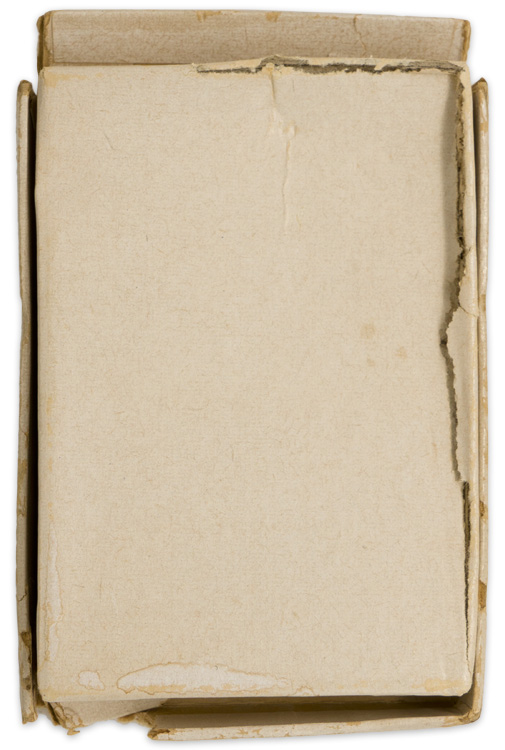 A two piece cardboard box with friction top lid that is stamped "Defence Medal". Shows war with some tearing.