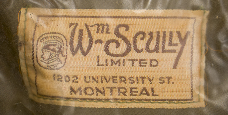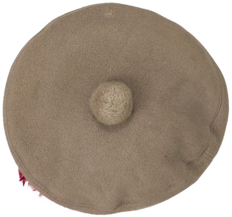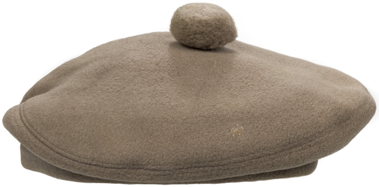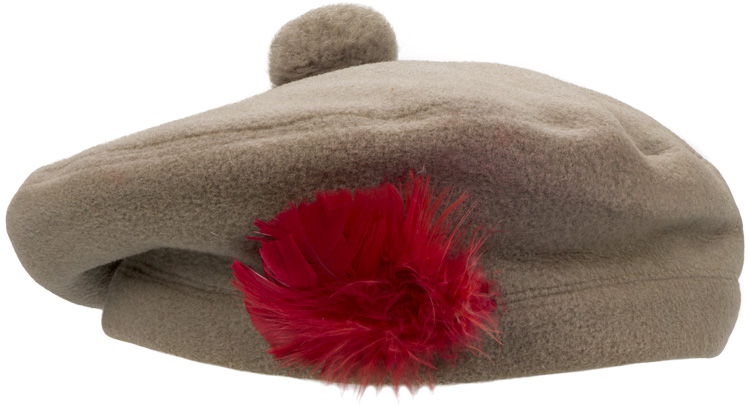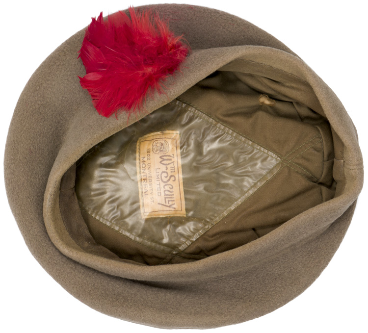 The Balmoral Bonnet, which is known as the Tam o'Shanter, originated in 1915, as a replacement for the Glengarry, to be worn by Scottish troops in combat. A fawn/tan bonnet comprised of a crown with a tan coloured wool Touri (pom pom) to its center, a body with a seam to the rear with a period red hackle to the left side. The interior is lined with a “sweat shield” that bears the manufacture label for “Wm Scully Limited, Montreal” beneath. (Ex Taboika Collection)