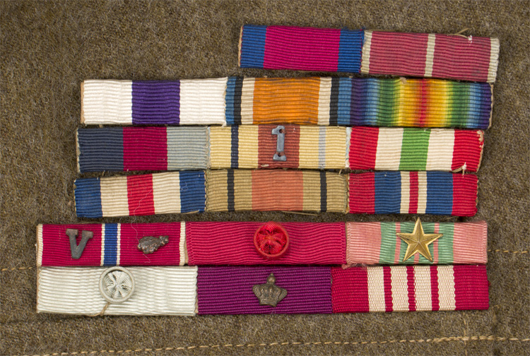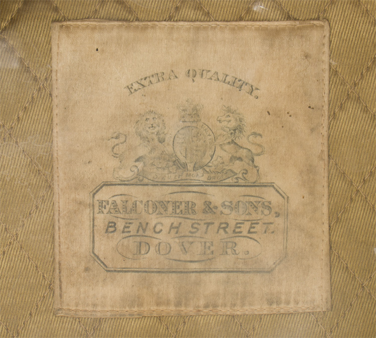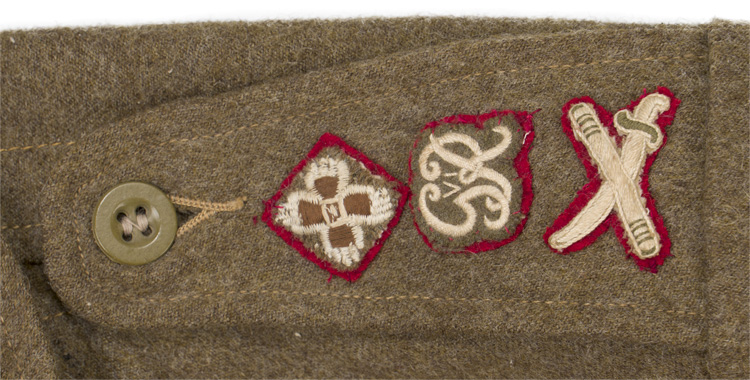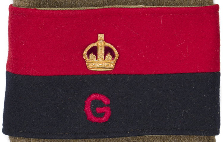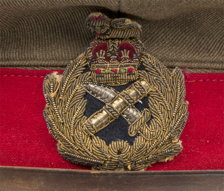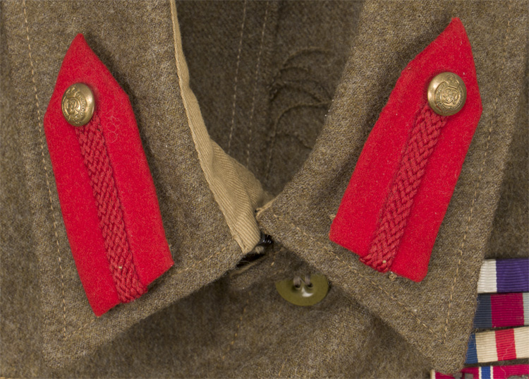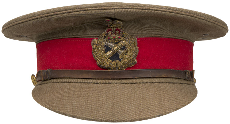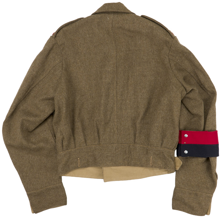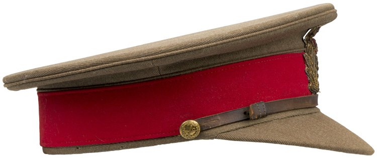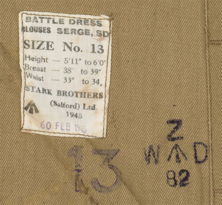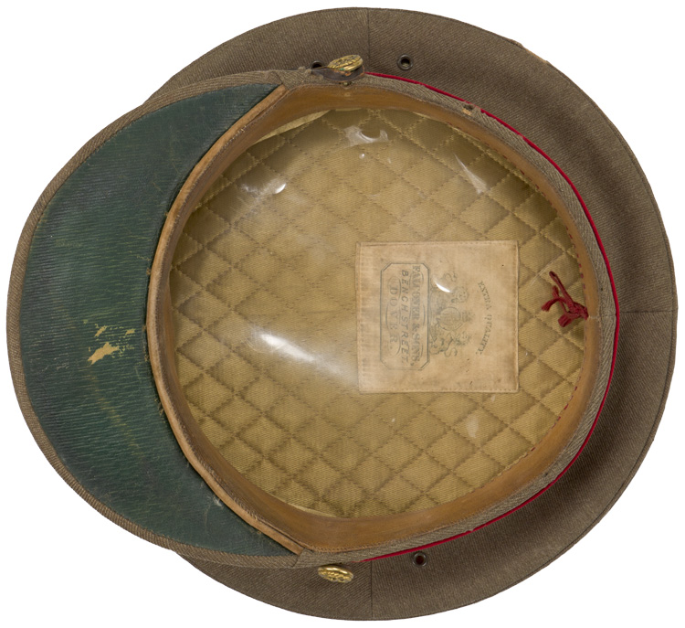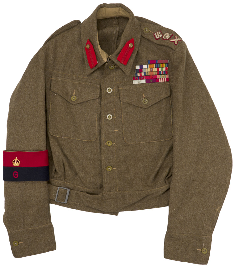 This grouping consists of a General Officers visor cap manufactured by Falconer & Sons Bench Street, Dover that is approximately size 55. A red “dickie” is included that is worn under the collar of the tunic, and tucked into the jacket. Two of the three male snaps are missing. It measures approximately 38cm long and is 41cm wide to the top that includes the straps. A hole is present. The battledress has a five painted, dish button front that leads to a lay down collar with a pair of hooks and eyelets to the neck. The integral button shoulder straps bear the rank insignia for Major General, as well as the cyhpers “GR” that signify aide de camp to King George VI. A pair of Brigadier collar insignia are to each collar point. A Staff officer brassard is to the right arm. Above the left breast is a seventeen place ribbon bar that includes a DSO, OBE, MC WWI and WWII, as well as campaign medals for France and Italy, as well as numerous foreign decorations. The interior bears a tag indicating a Size 13 tunic, manufacturer name and date, as well as a broad arrow.