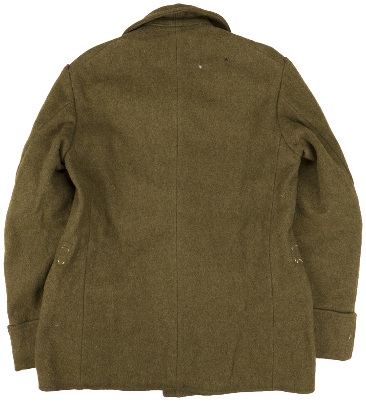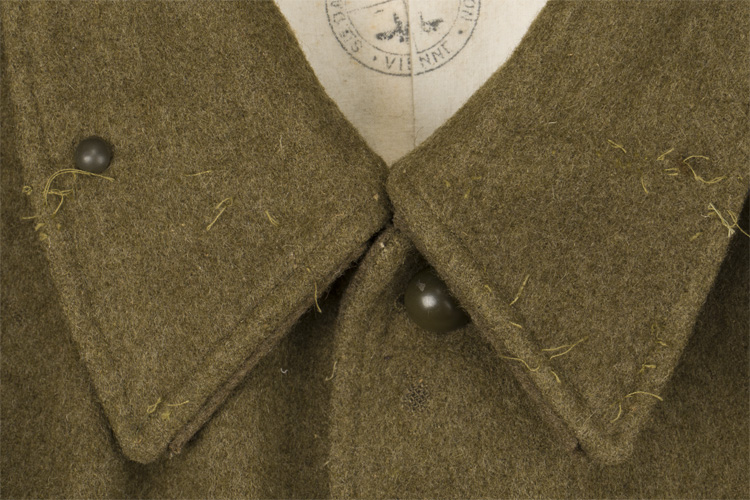 A wool tunic with a five, rounded button front leading to a laydown collar with a single hook and eyelet to the neck opening. Under each collar point is a triangular section of wool that is held secure to a small button, but can be extended across the throat when the collar is turned upward. Collar insignia has been removed, as can be seen by the remaining threads. The shoulder straps have been cut off. A pair of hip pockets are to the front with a fold over angular flap. The interior is lined in a white cotton that is stamped with a cartouche. The chest measures approximately 38". The wool shows typical wear/knapping. A larger moth hole is to the reverse panel.