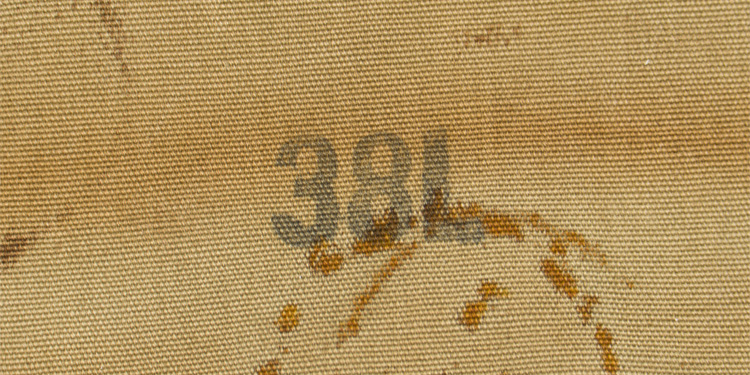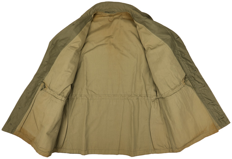 An olive drab, lightly padded, 3/4 length, canvas jacket. It has a six button French fly front closure, two patch saddlebag breast pockets and two horizontal slash, internal hip pockets, all four with scalloped button down flaps, which hide the buttons. The button cuffs have outside sleeve slashes with internal wind flaps. The fold back lapels have a, dual button holed, turn up flap under left lapel with a securing button. The lay down collar has a button under each forward edge, for the fold up flap and/or hood attachment while to each shoulder are button down shoulder straps. A shoulder flash for the 1st Infantry Division is handsewn to the left wearing sleeve. The fully lined interior comes with a tunnel looped drawstring at waist line. A white label is sewn to the interior of the right wearing hip pocket that shows the size as "36R" and manufacturer of "North Jersey Leather Coat Co., Inc." along with a 1943 date. A stamp to the interior neck shows he size as "38L" with some staining present. There is also a small cardboard tag stapled to the interior.