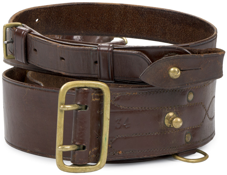 BACKGROUND: Sam Browne was a British officer who was serving in India when he lost his left arm in combat. In that time, officers wore a sword into battle which hung from the waist belt in a frog, but when charging the enemy, the sword had to be steadied with the left hand. Sam was now unable to perform this movement, but cam up with the alternative of wearing a second belt that extended over the right shoulder and held the scabbard in place. It soon became part of the standard uniform. The "Sam Browne" harness was normally worn by officers with the Service Dress Jacket and consisted of a waist belt, one or two cross braces, a pistol holster, an ammunition pouch and a sword frog with hanger straps. The harness items were made from polished bridle leather and depending on the regiment, with brass or white metal fittings. With the introduction of the austerity pattern jacket, the "Sam Browne" harness was replaced with cloth belts.