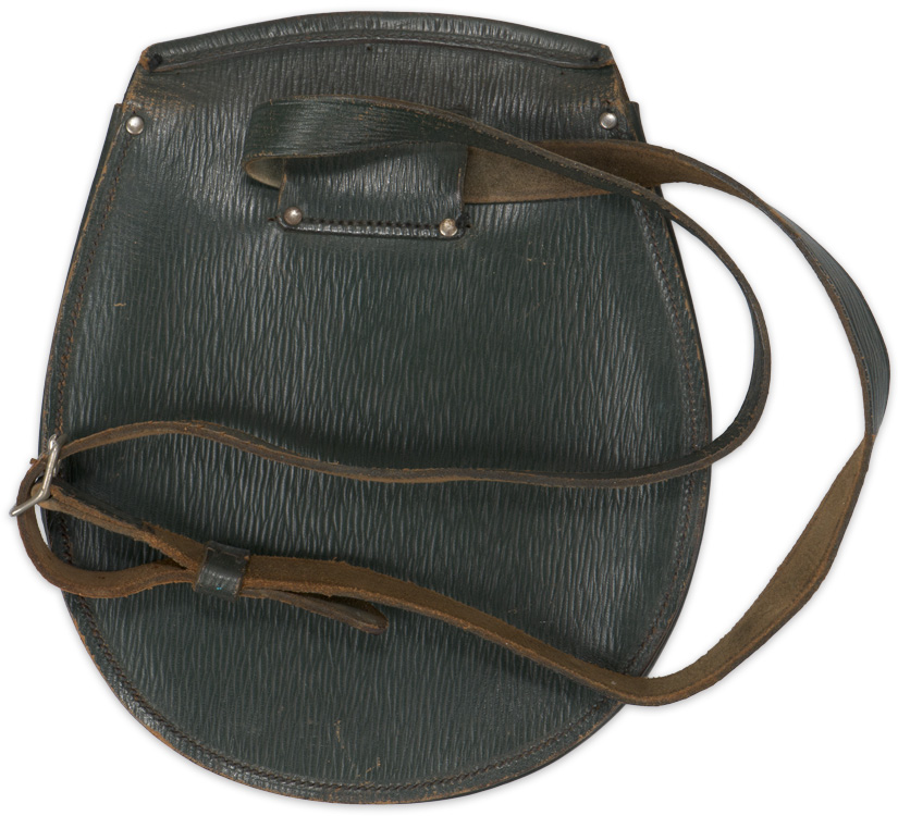 An Officer’s green leather sporran with badge and waist straps and buckle to the reverse. The sporran measures approximately 21cm wide at the widest point x 25cm tall.