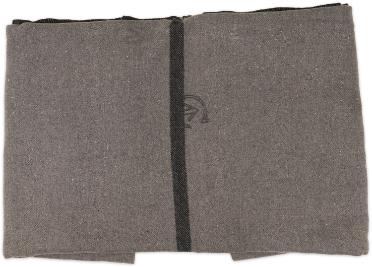 A grey/blue wool blanket with 3cm wide stripe measures approximately 133cm x 200cm. A "C" broad arrow is woven into the wool. There is a sewn repair to one end. Shows typical usage and wear.