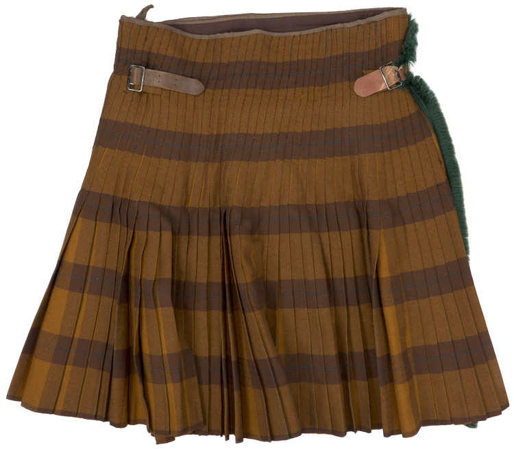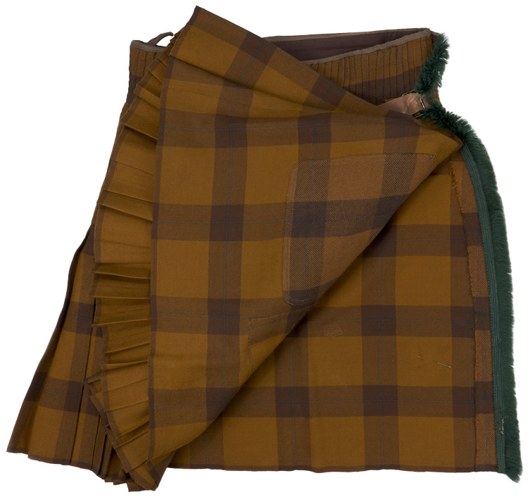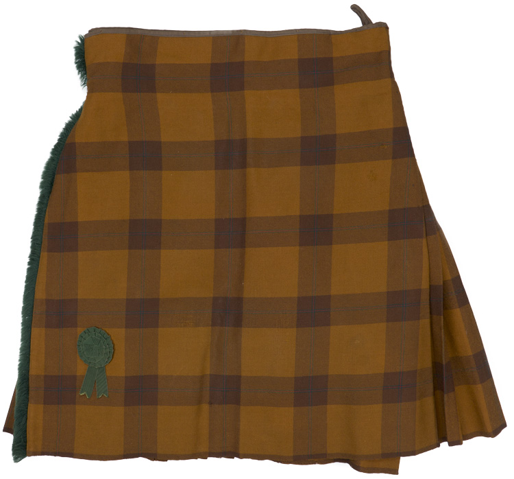 A pleated wool kilt in the pattern of the Irish Regiment of Canada with a pair of brown leather straps with the corresponding single prong buckle to each side. A green rosette (or bow) is to the front bottom left. This rosette or bow is worn by Senior NCO’s of this regiment. The interior of waist in fully lined and trimmed. The waist measures approximately 36" and is 24.5" long. There is no mothing or holes present. (Ex Taboika Collection)