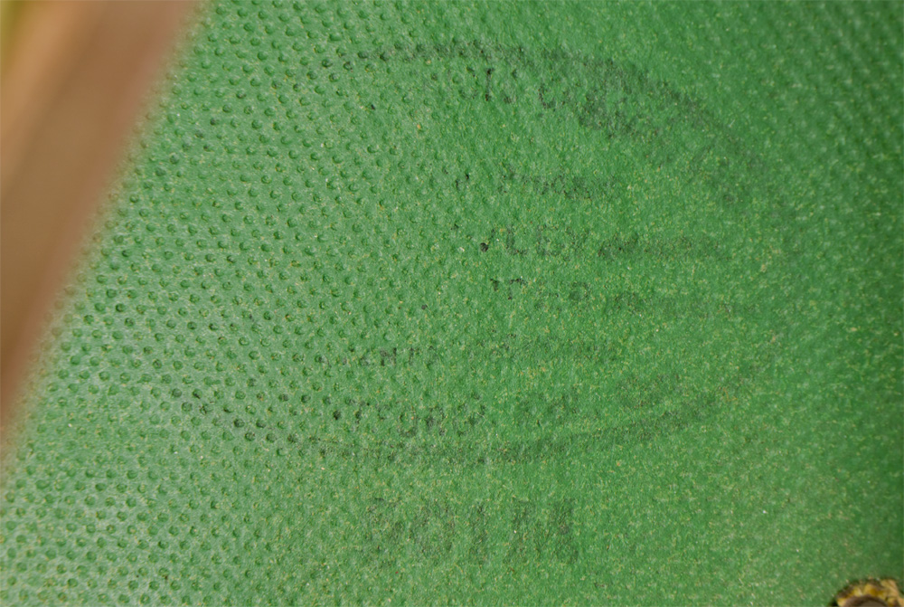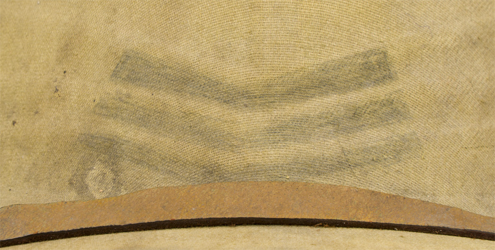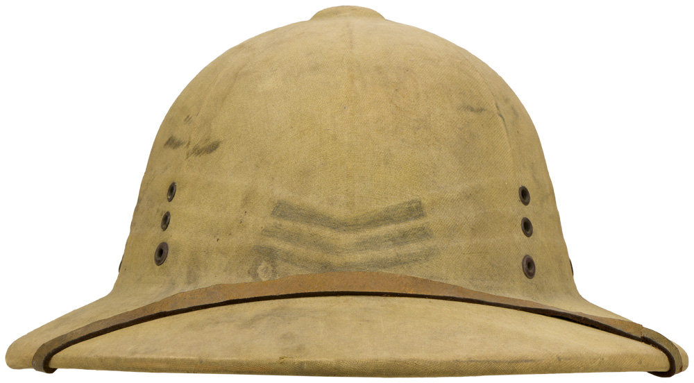 A khaki covered, pressed fibre helmet with nine grommet holes to each side. Three chevrons denoting the rank of Sergeant is to the front. To the interior is the original liner that is held in place by two grommets on each side, while a third secures the chin strap. The interior is stamped with a Brantford manufacture marks, as well as a "C" broad arrow. The khaki covering shows usage and wear. The helmet measures approximately a size 50. The liner has become stiff.