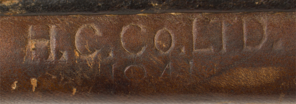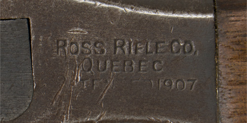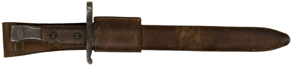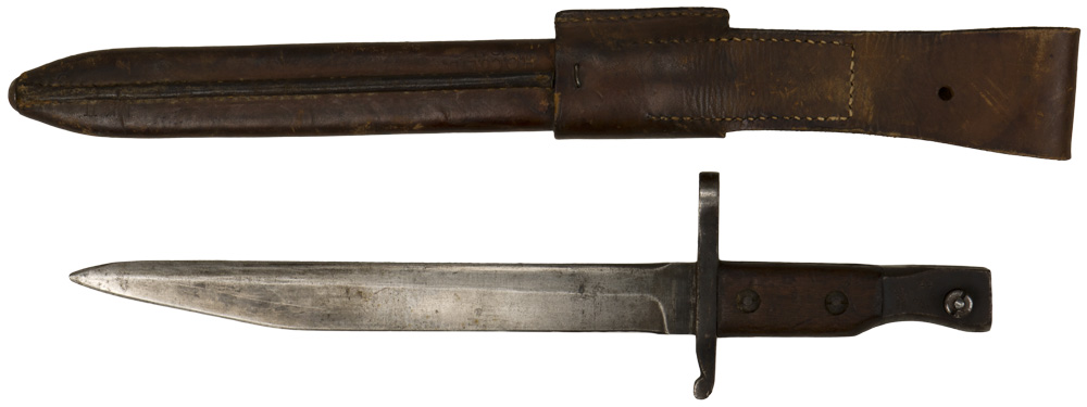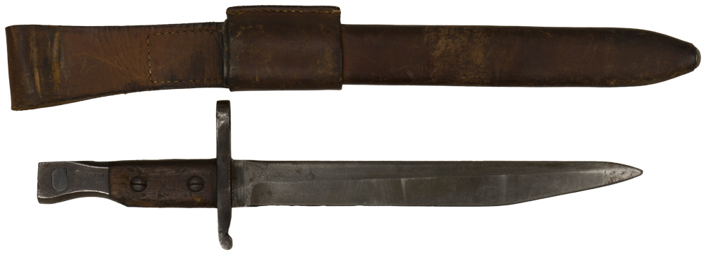 DESCRIPTION: A Mark II knife/bayonet. The wooden grip is held in place by a pair of screws. Pommel is marked "Ross Rifle Co., Quebec. Patented 1907". The brown leather scabbard is marked "H.C. Co. Ltd.1941", "M.K II" along with a "C" broad arrow.