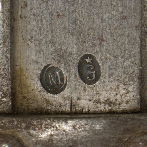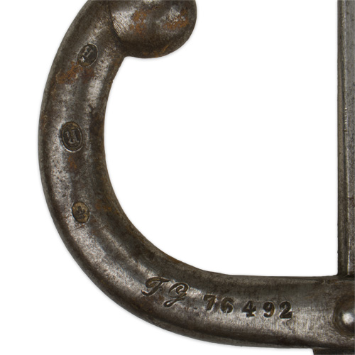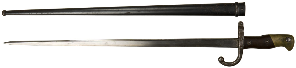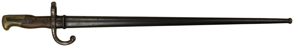 An 1874 "Epée" (sword) bayonet. The bayonet’s brass, contoured bird’s head pommel has a stud guide and stud. The contoured wooden grips are fixed with two rivets. The contoured metal crossguard has a ball tip to its curved end and a circular muzzle guide to the other. Decent, clean blade. Engraved along the back of the blade is "Mre d’Armes de St Etienne Juin 1881." Complete with nice original scabbard. Matching serial numbers "F.G. 76492"