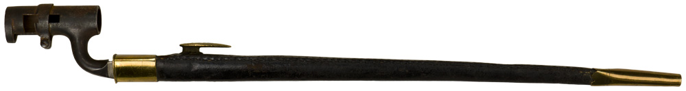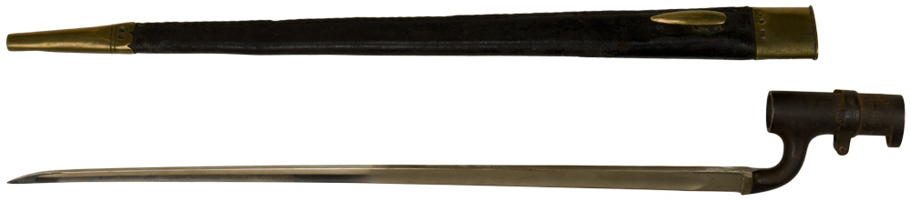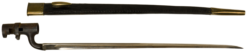 Nickel/silver plated, (43cm) or 17" long, tapering triangular blade with fullers to all three sides. Plating shows minor surface spotting and tarnish. Blade marked with stamped "E" , King’s Crown and "23". The socket, with a screw adjustable bracket, retains a matte grey finish and shows moderate surface spotting. The socket is marked "17" "379". Blackened leather scabbard has a stitched edge seam and brass fittings to both the top and bottom. Top fitting has its retaining lug intact. The top and bottom brass fittings retains intact. The scabbard is broad arrow "WD" (War Department) marked, and Crown over "17". Of Note: The M1853 Enfield rifle, socket bayonet, was used from 1860 to 1866 and was later replaced by post 1866 scabbards used principally on Snider Rifles.