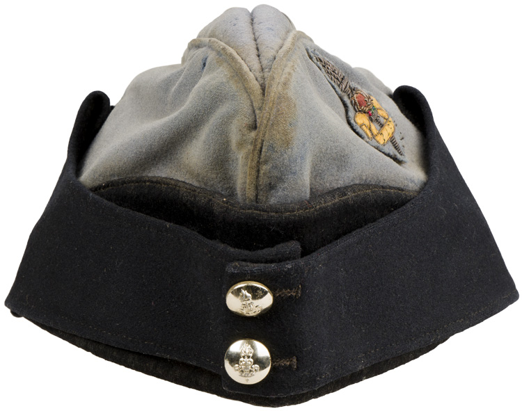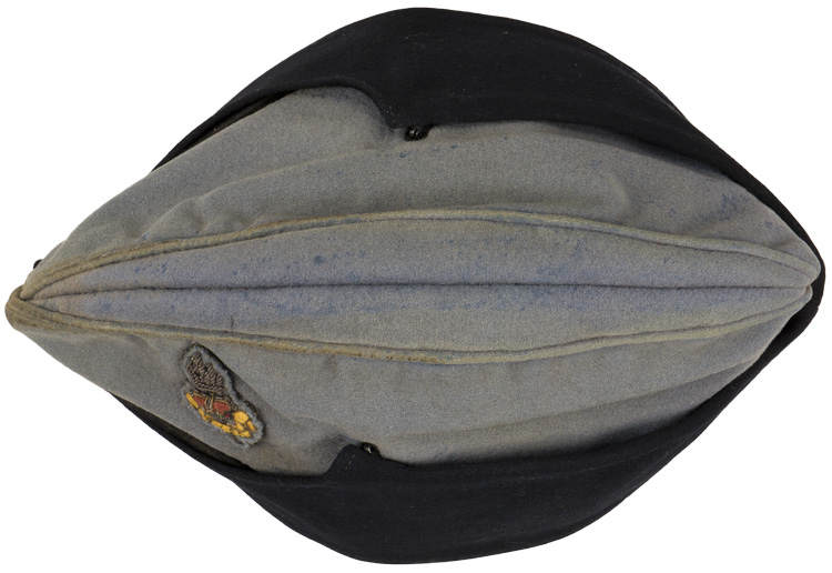 A blue grey and black wool service cap that bears a pair of modern, small "RAEC" buttons to the front, but a WWII wool and bullion badge sewn to the left side. The interior is fully lined in a black ribbed silk/rayon, along with a black velvet sweatband. A manufacture tag for "Gieve Limited London" is sewn to the lining.