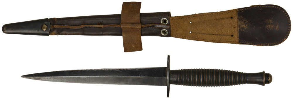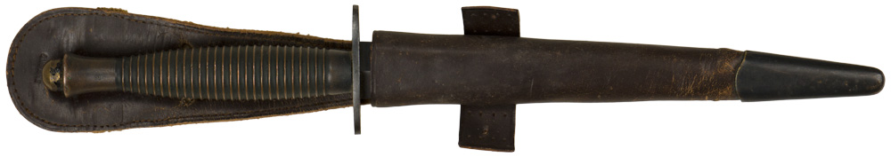 PHYSICAL DESCRIPTION: A third pattern Fairbairn-Sykes fighting knife with a 17.5cm stiletto style blade with high central spine. The blade in excellent condition. The cast blackened brass handle has twenty-seven concentric rings. The number "2" is stamped to the bottom of the grip. The knife has a straight 5cm wide cross guard with "England" marking. The brown leather scabbard has a, round tipped, riveted on, blackened brass fitting to the bottom and raised, stitched spine to reverse. Sewn to the spine is a leather tab that were used for stitching the sheath to clothing. Rivetted to the top of the scabbard is a leather tab with slashes for leg straps and the elastic retaining strap for the knife. Of Note: It was common, after the war, when surplus knives were exported out of the United Kingdom for sale, the country of origin was stamped on either the cross guard or scabbard.