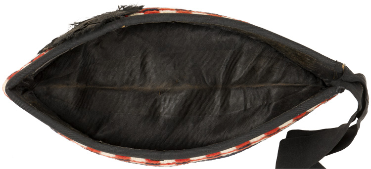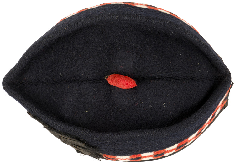 PHYSICAL DESCRIPTION: A black woven wool "wedge" cap has a red wool Touri (pom-pom) to its crown, black rayon edging along its base, and approximately 26cm long, dual black rayon ribbons, with swallow-tail cut ends, extend from its reverse. A 3cm tall diced band is along its sides, in white, red and black, over the left front of which is fixed a black rayon rosette. The interior is fully lined.