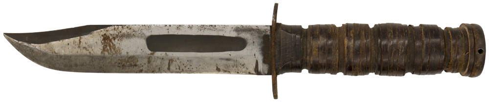 A blued fighting knife and mid-brown leather scabbard. The knife’s 18cm blade, with swedge and short fuller. The blued double crossguard is stamped ""Ka-Bar" to one side and "U.S.M.C." to the other. The horizontally ribbed, brown leather grip exhibits period wear and use. To the top of the blued steel pommel may be seen the end of the tang. Shows moderate/heavy usage and wear.