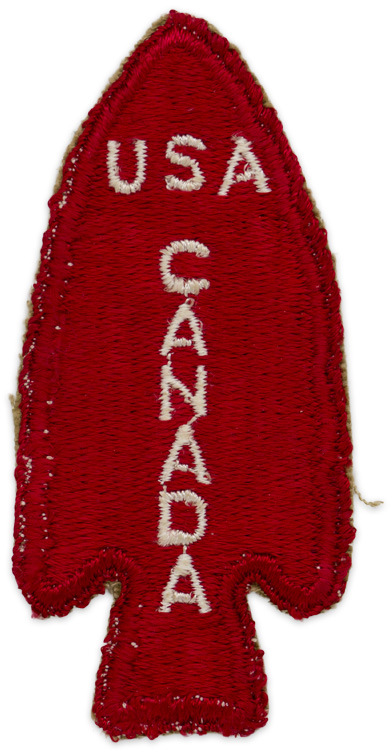 An arrow shaped, machine embroidered white text "USA" & "CANADA" on a red background. Measures approximately 8cm x 4cm. Some slight wear to the edges. Quite scarce.