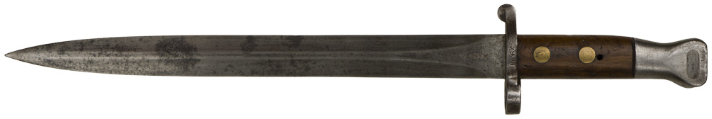 A British pattern 1888 bayonet Mk.I second type with two large rivets in the handle. The unsheathed bayonet has an overall length of 42.1cm. Its contoured bird’s head pommel has a stud guide and stud. The contoured wooden grips are fixed with two rivets. The contoured metal cross guard has a circular muzzle guide to its upper extension. Its 30.5cm bright blade is double edged with no fullers. Ricasso is stamped the "WD broad arrow" acceptance mark used by the British government. Other side is ,maker marked with Crown & VR markings. The blade shows some pitting. Scabbard not included.