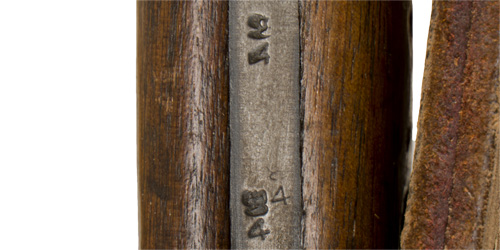 DESCRIPTION: A Mark II knife/bayonet. The wooden grip is held in place by a pair of screws. Pommel is marked "Ross Rifle Co., Quebec. Patented 1907". The brown leather scabbard is marked with a 1916 date, "M.K II" along with a "C" broad arrow.