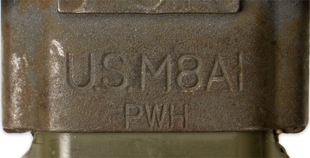 PHYSICAL DESCRIPTION: A blued fighting knife/bayonet and scabbard with an integral frog. The knife has a metal pommel with a locking mechanism. The unmarked blade measures approximately 17cm in length. Its horizontally ribbed, brown leather grip is age darkened as expected. Its blued metal double cross guard has a muzzle ring to its upper extension. The 19cm scabbard has a metal throat with downwardly-angled projections to either side, and to whose obverse is stamped "U.S. M8A1" and "PWH". A vertical projection extends from the back of the throat, to which the 14cm tall olive drab canvas frog is doubly riveted. The frog has a horizontal retaining strap riveted to the upper portion of its formed belt loop, with metal tips to either end of the strap and a brass snap button. At the very top of the frog is small loop with a shaped wire belt hook. The olive drab-colored bakelite scabbard itself tapers at its tip where there is a hole for a tie string. String is included.