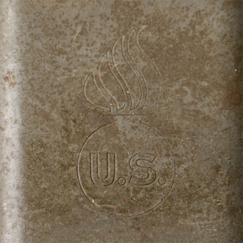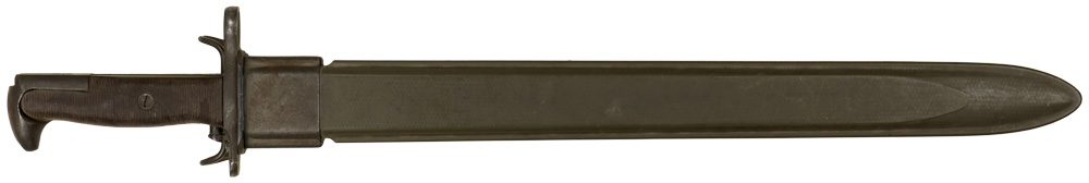 A blued bayonet with black bakelite grips and an olive drab metal and composite material scabbard. It has a 40.5cm, single-edged blade, with a swedge and long fullers. , To the reverse ricasso is stamped "A.F.H.", "U." and "S." flanking a circle ringed by another circle, with four waving lines radiating above it as well as a 1943 date. The blued cross guard has a muzzle ring to its upper extension, and a spring-loaded locking button to the lower side. Its horizontally ribbed bakelite grips are fixed by a counter sunk screw. Scabbard has a metal throat, with most of the olive drab paint missing, to the obverse of which is stamped "US" withing a flaming bomb. The top of the throat extends backwards and wraps around a metal wire belt hook. Short, hooked posts are to either side of the scabbard opening, which mate with the depressions to the cross guard, that to the left engaging the aforementioned locking button.