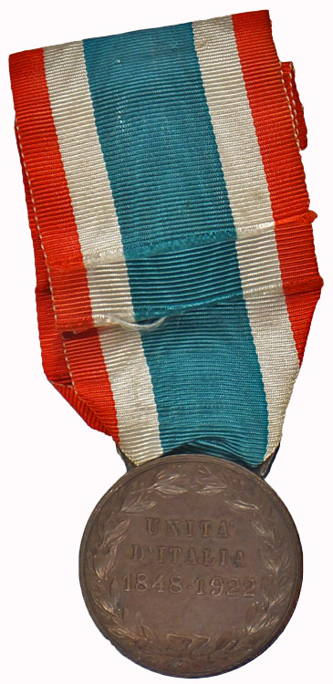 PHYSICAL DESCRIPTION: A 3cm diameter bronze medallion featuring the profile of Vittorio Emanuele III to the front and is inscribed "Unita D’Italia 1848-1922" to the reverse. The ribbon, or red, white and green, is suspended from a fixed loop.