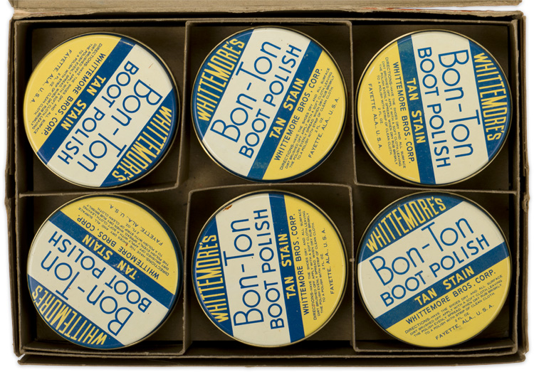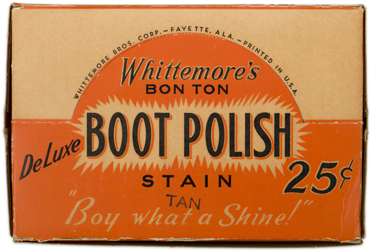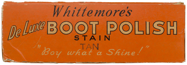 An 7cm x 14cm x 21cm, store display, cardboard printed carton of 12 un-opened containers of "tan" boot polish. The carton shows some teaings along the rear, front cover, and front corner folded seams, but otherwise is in very nice condition.