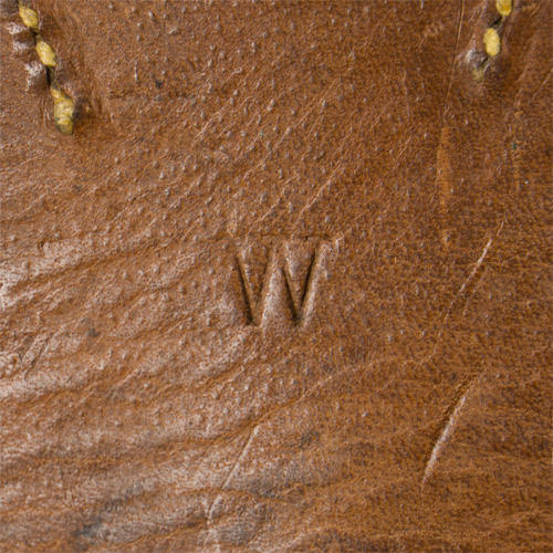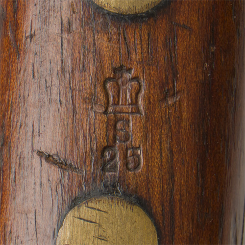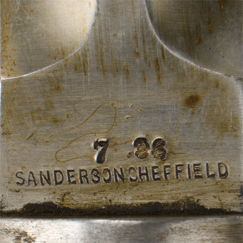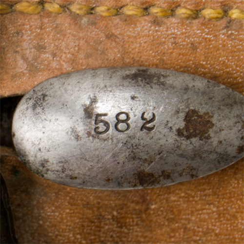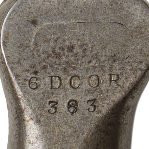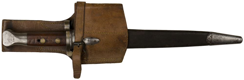 A pattern 1888 bayonet with leather Oliver pattern frog. The unsheathed bayonet has an overall length of 42.5cm with a 30.5cm long blade. Its contoured bird’s head pommel has a stud guide that is marked "6DCOR" for the 6th Regiment Duke of Connaught’s Own Rifle. The age-darkened, scratched and lightly pitted, contoured wooden grips are fixed with two large rivets and a cleaning hole drilled through it. The contoured metal cross guard has a circular muzzle guide to its upper extension. Its blade has wide fullers extending most of its length. To the ricasso is stamped the War Department acceptance mark used by the British government, bending mark and a Crown over "S" that is the Soligen maker mark. The reverse ricasso is stamped "Sanderson Scheffield". The blade is bright with light surface spotting. The Mk l scabbard, which is 32cm long, is comprised of thick, blackened leather, whose vertical seam is to its reverse, with contoured metal fittings to its top and bottom. The fitting to the top has a staple securing its mouthpiece, to the body of the scabbard, to both the obverse and reverse. An oval lug is to its obverse center. The bottom fitting also has securing staples, but near its scalloped top, obverse and reverse, and it tapers to its rounded base. This fitting is loose. The leather body of the scabbard shows light scratching & chafing. The frog stud is marked "582". The brown leather frog is maker marked to "H. Carson Maker Ottawa".