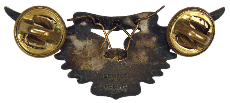 A two piece sterling pair of wings measuring approximately 2cm x 5cm with a central gilted emblem of a fouled anchor with "Air Crew" below. Surmounting the wings is a ribbon with three five pointed stars which are attached by fine pieces of wire that are inserted through corresponding holes and folded at the reverse to keep in place. Two pinch clasps are to the reverse which is flat and is inscribed "Gemsco N.Y." and "Sterling." The badge shows heavy wear and age, but overall a very nice, fully intact piece.