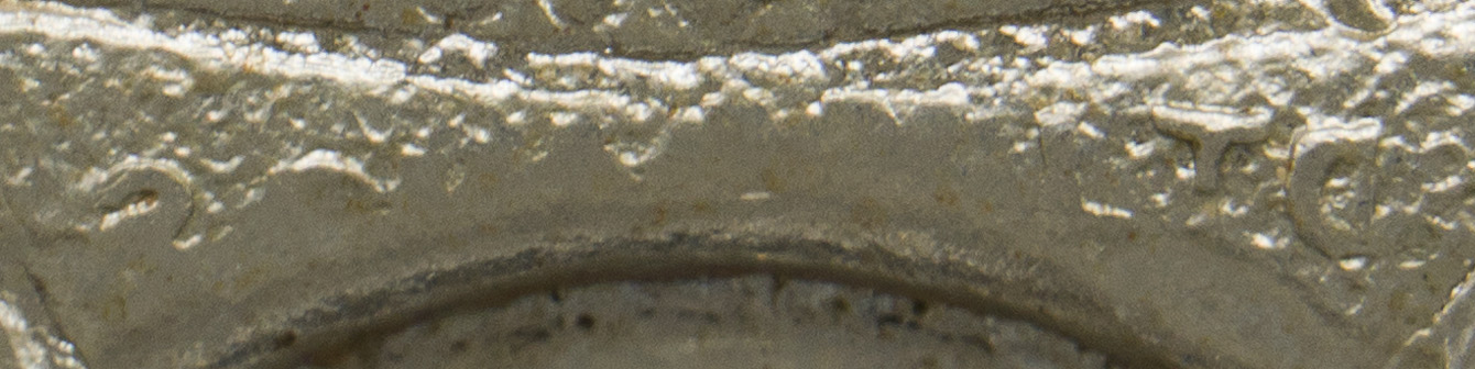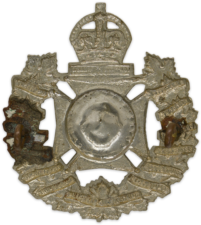 PHYSICAL DESCRIPTION: A silver allow cap badge that shows a "little devil" to the center of a maple leaf wreath intersected by scrolls with a list of battle honors with a Kings Crown at the top. It measures approximately 4.5cm x 5cm. The reverse is a mirror image of the front with two lugs in place.