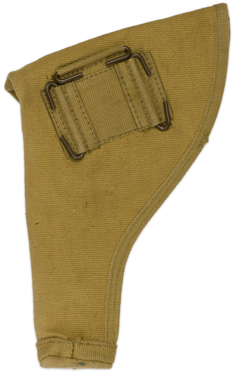 PHYSICAL DESCRIPTION: A standard issue tan/khaki web holster for pistol or revolver with brass fittings. The tan-colored, webbed canvas holster is about 25cm tall and 19cm wide along its top, tapering to 6cm at its reinforced base. It has a fold over top flap with brass snap closure. The edges are reinforced with additional stitched on webbing. There is a brass drainage grommet to bottom. Sewn to the reverse is a piece of webbing about 6.5cm x 9.5cm folded over on three sides to create loops through which three, brown painted, brass belt hooks have been inserted. Stamped in black ink to the interior top flap is a faint manufacturers mark of "Z.L. & T. Ltd." with a faint "C broad arrow", indicating it was issued through the Canadian Quartermasters Office. Nice example. Unable to discern date issued.
