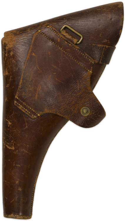 PHYSICAL DESCRIPTION: A brown leather holster approximately 34cm long that tapers from 16.5cm to a 4.5cm diameter bottom. A double stitch seam holds the one piece construction in place with a separate circular bottom stitched to the main body. A brass stud on the fold over flap allows a 13.5cm long strap to secure the cover and allow for a quick release. A square brass ring is secured to the top of a larger shaped leather piece that is double stitched to either end to allow for a belt to be passed through and a brass hook that allows for the attachment to the Sam Browne belt.. The leather has remains strong and supple. No apparent markings.