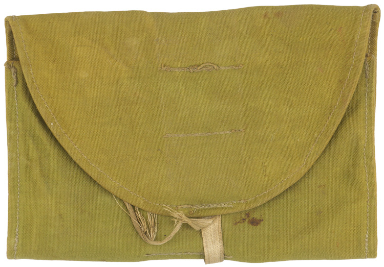 A khaki pouch measuring approximately 43cm x 17cm when fully opened. To the interior are loops that hold various personal items secure i.e. razor, comb, etc. No contents included. The interior is "C" broad arrow stamped, as well as, manufacture marked. The rolled kit measures approximately 23.5cm x 17cm.