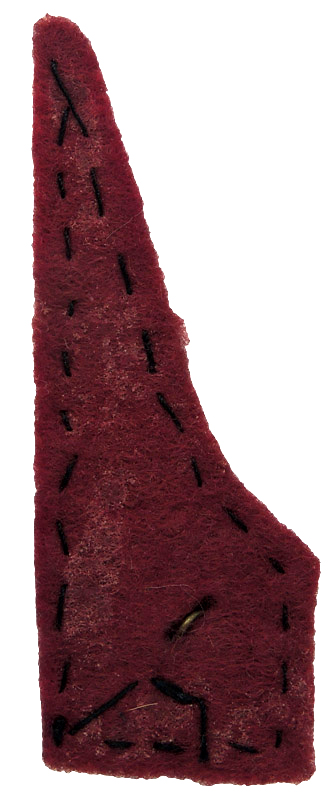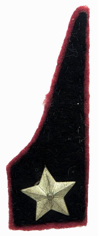 An 7cm x 3cm, black wool construction collar patch with maroon piping and a single silver washed rank pip.