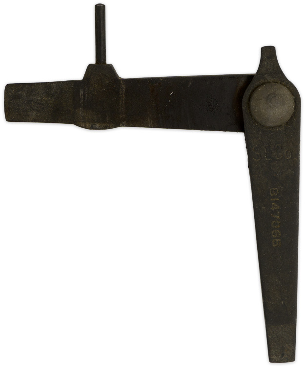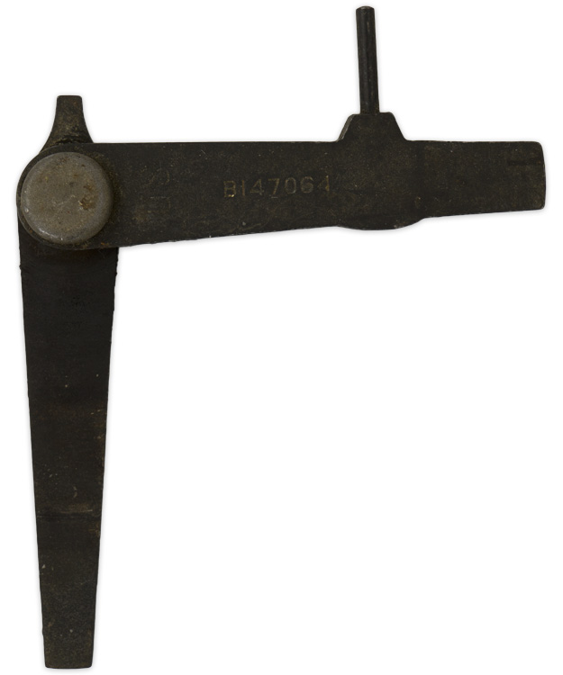 A blackened steel tool with a right angle "U" shaped cut which serves as a mainspring clamp, a pin punch on the lower arm and a pair of flat screw driver blades to the end of each arm. The side is etched "U.S., B147064" and "SE Co."