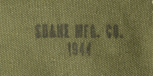 A khaki green canvas bag that measures approximately 95 cm long x 23cm wide at the widest point and 9cm wide at the smallest point. An adjustable webbed strap is present to one side. The heavy zipper is in good working order. It is manufacture marked and dated for 1944.