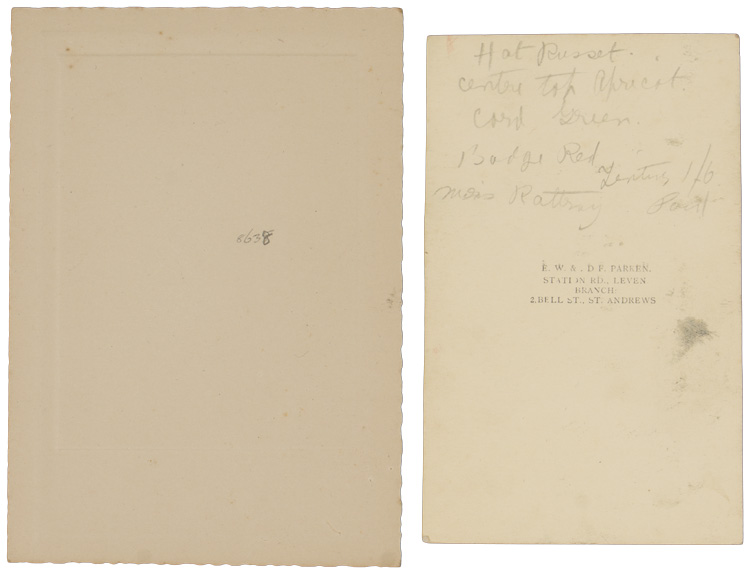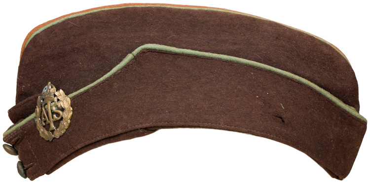 A dark russet brown wool forage cap with green trim and a apricot inset to the crown. A pair of British general list buttons are to the front, as well as an A.T.S. cap badge to the left side held in place via slider. The interior has a herring bone twill tape sweat band and a water proof liner that has hardened with time. Included is a pair of small black and white portrait photographs of the same woman.