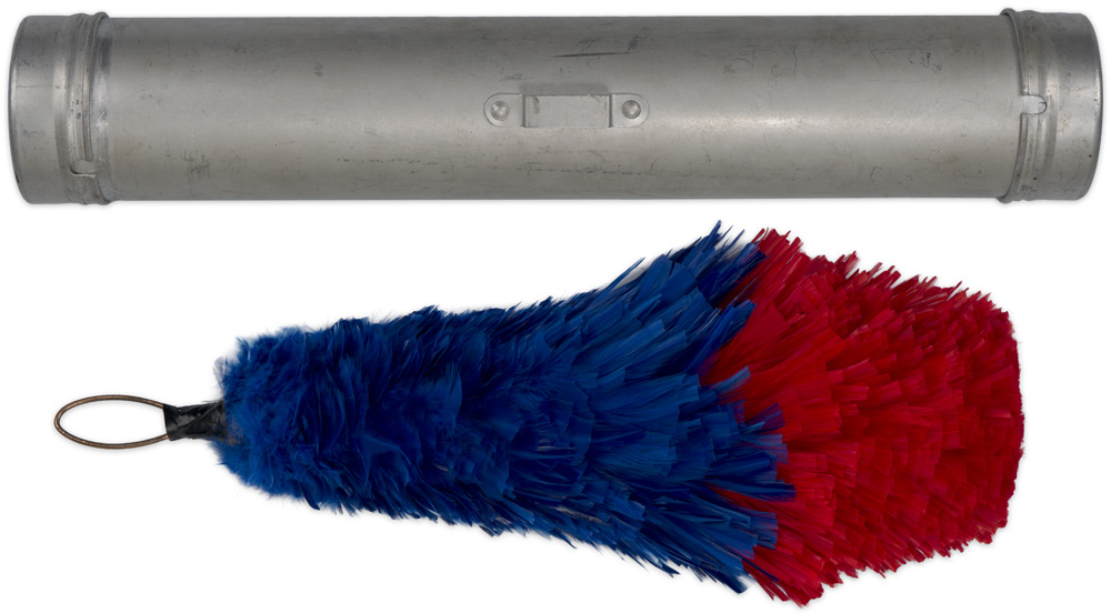 Red and blue plume, in its original 41cm long aluminum storage case.