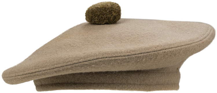 A soft tan wool bonnet comprised of a crown with a tan/brown coloured wool Touri (pom-pom) to its center, a body with seam and bow to the rear. The interior is lined in tan silk/rayon with a manufacture tag for Wm. Anderson & Sons. Ltd. Of Edinburgh. The size is approximately 52.